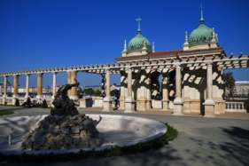 Neorenesančni dragulj Miklósa Ybla, Bazar Várkert, zgrajen med letoma 1875 in 1883 ob vznožju Várhegyja, na mestu hiš z “neopranimi hrbti in dimnimi dimniki”, južno od srednjeveškega stopnišča Vodni voz, je bil prvotno trgovska stavba, kasneje uporabljena za ateljeje in razstave, v Kádárjevem obdobju pa za prireditve popularne glasbe. Neptunova streha Gloriette, ki jo s strani varujeta dva leva (eden predstavlja vojno, drugi mir), je v središču sistema zavitih klančin, ki ga ograjujeta dve paviljonski stavbi. Na neorenesančnem vrtu, zasajenem s posebnimi sortami vrtnic in skrbno izbranimi sadikami, je Tritonov vodnjak, ki ga je leta 2013 rekonstruiral Attila Csák: sin Pozejdona, očeta morskih deklic, drži v naročju Amorja, ki mu sedi v naročju in je odgovoren, da se je njegova hči zaljubila v moškega.